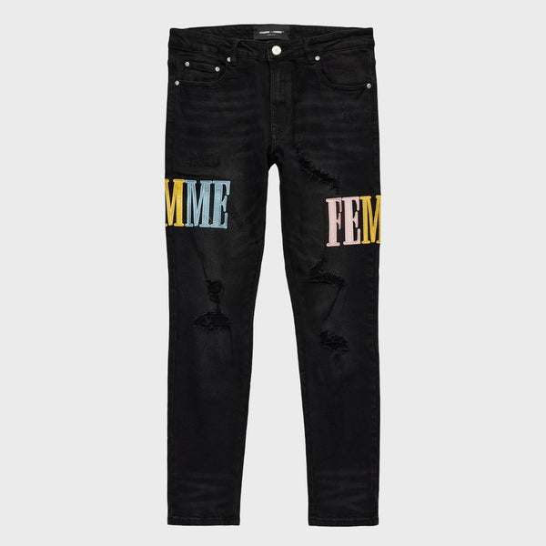 HOMME FEMME Letterman Denim Black Baby Blue Pink & Yellow (HFSP202111) Sale price$150.00 USD Regular price$185.00 USD