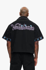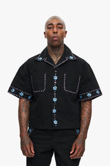 A bold blend of elegance and edge. The “Under Pressure” button down is cropped for a boxy silhouette, detailed with floral gem appliqués and pearl-like studs along the seams, pockets, and cuffs. Made from sturdy black cotton, it brings upscale attitude to warm-weather dressing.