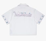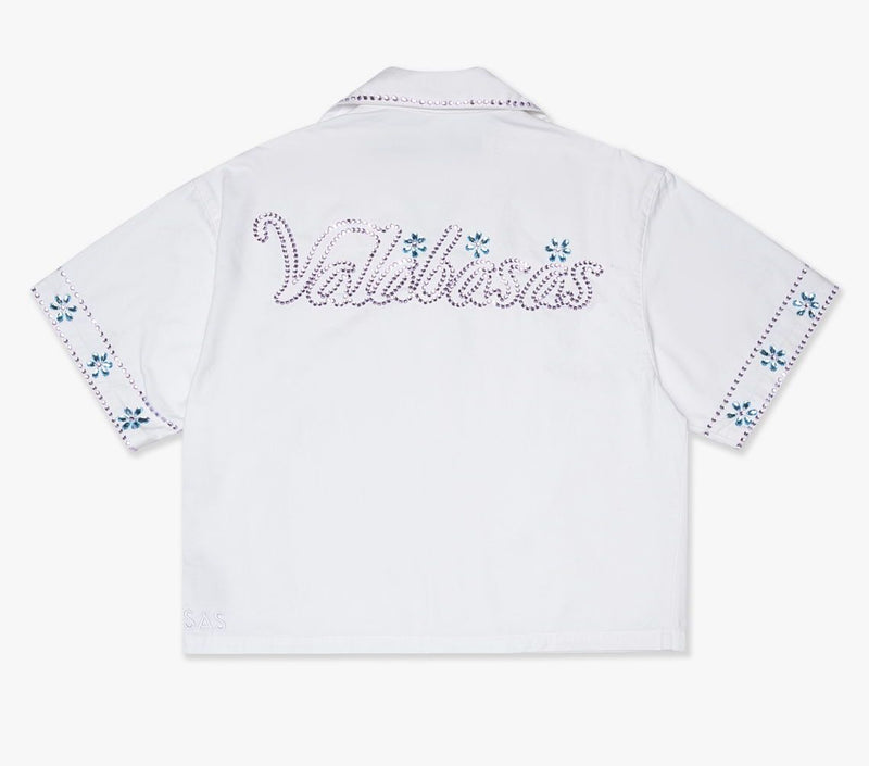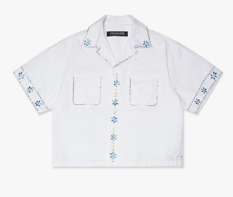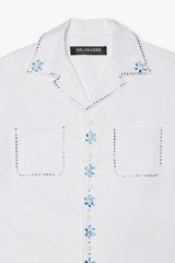 A bold blend of elegance and edge. The “Under Pressure” button down is cropped for a boxy silhouette, detailed with floral gem appliqués and pearl-like studs along the seams, pockets, and cuffs. Made from sturdy White cotton, it brings upscale attitude to warm-weather dressing.