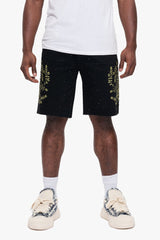 make a bold statement with the written” denim shorts. featuring all-over text details, premium stretch denim, and a tapered streetwear fit. perfect for summer styling.